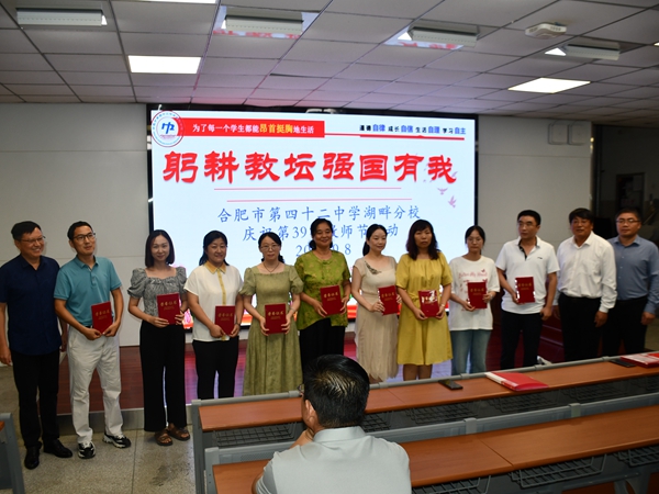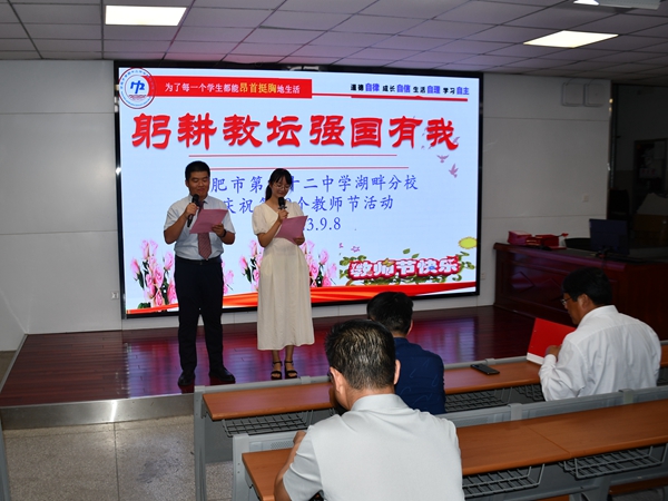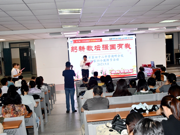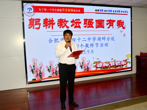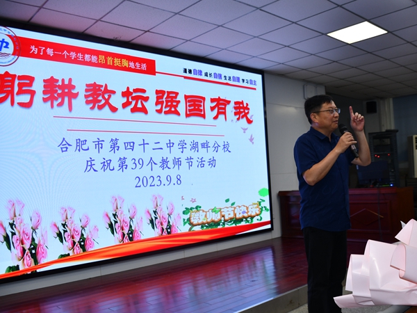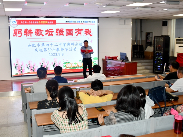 躬耕教坛,强国有我。在金风送爽、硕果满枝的美好时节,迎来第39个教师节。2023年9月8日下午,合肥市第四十二中学湖畔分校庆祝第39个教师节活动在综合楼一楼合班教室举行。活动由朱恺、陈佳佳老师主持。
