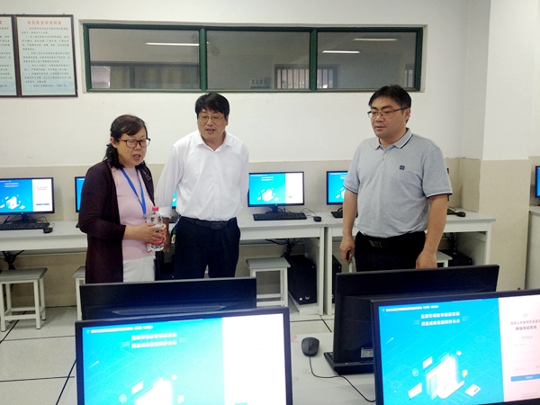 在校长室的陪同下,刘彩虹校长实地查看了学生问卷监测室、监测工具保密柜及样本校义务教育质量监测公示栏等硬件措施的准备情况,现场查阅了学校义教教育质量监测的过程性文字材料,包括样本校迎监方案、应急预案、门贴桌贴等,崔北好副校长代表学校就前期的软硬件工作准备、专题工作培训、师生模拟上机操作等工作具体做了汇报和介绍。
