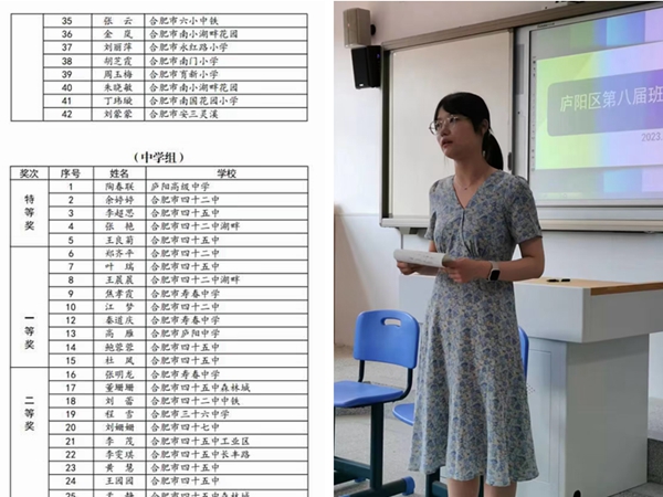 5月26日,在合肥市第四十五中学森林城校区举办的2023年庐阳区第八届中小学班主任基本功大赛中,合肥四十二中湖畔分校张艳老师荣获中学组特等奖,王晨晨老师荣获中学组一等奖。
