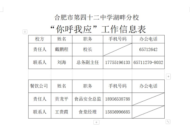 “你呼我应”工作信息表