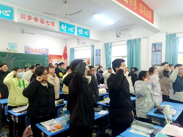 九(7)班举行了十四岁集体生日暨迎新活动,同学们迎来了一场意义非凡的十四岁集体生日庆典,用欢笑与感动为青春旅程铭刻下难忘的印记。活动现场,五彩的气球与蛋糕相互映衬,同学们的脸上洋溢着青春的朝气。班主任老师精心准备的视频回顾了同学们从稚嫩的七年级到成熟的九年级,每一幅画面都承载着珍贵的回忆。同学们庄严举起右手宣誓:“要做雄鹰,有展翅辽阔苍穹的理想;要做骏马,有驰骋万里草原的豪情。顽强拼搏,共同进步,度过青春无悔的初中生活,实现人生美好的梦想!”同学们一边吃着蛋糕,一边诉说着十四岁的责任与担当。这样的集体生日会,不仅是年龄的跨越,更是心灵的成长。同学们勇敢迈向青春的新征程,书写璀璨篇章。